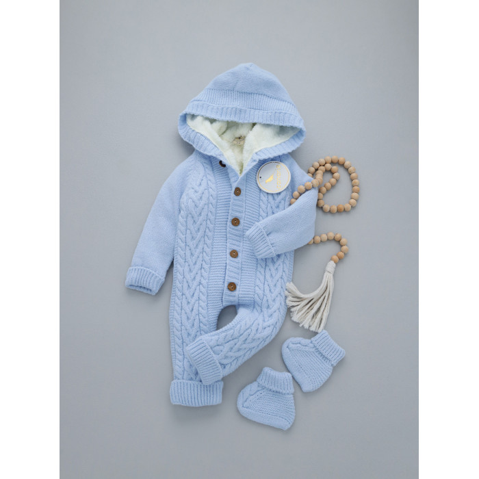 Комбінезон вʼязаний утеплений (Natural Wool) та пінетки Блакитний косичка широка 62 (3-6міс)
