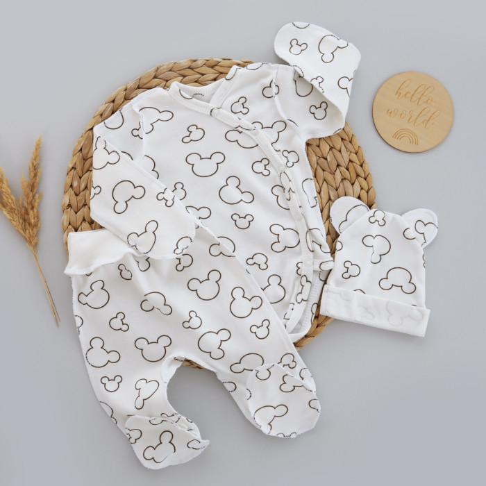 Набір 3в1: Боді, повзунки та шапочка Міккі Молочний (Інтерлок) 56 (0-3міс)