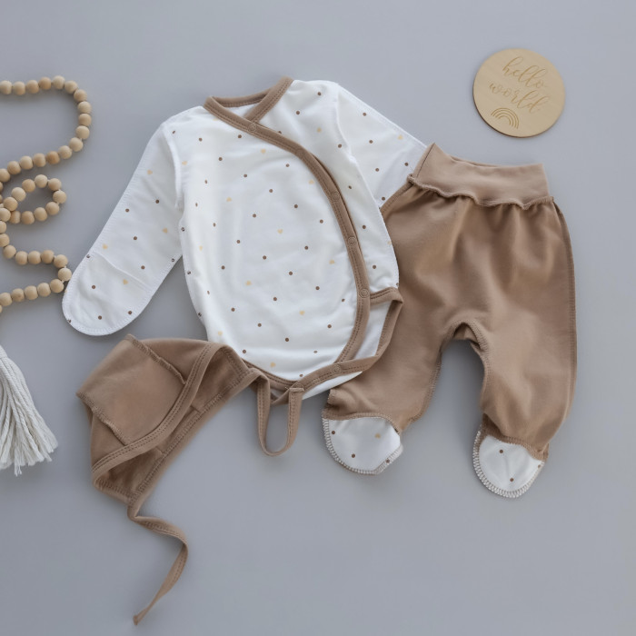 Набір 3в1: Боді, повзунки та шапочка на зав’язках Горошок Кавовий (Футер - з начосом) 62 (3-6міс)