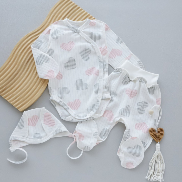 Набір 3в1: Боді, повзунки та шапочка на зав’язках Сердечка великі (Рубчик) 56 (0-3міс)