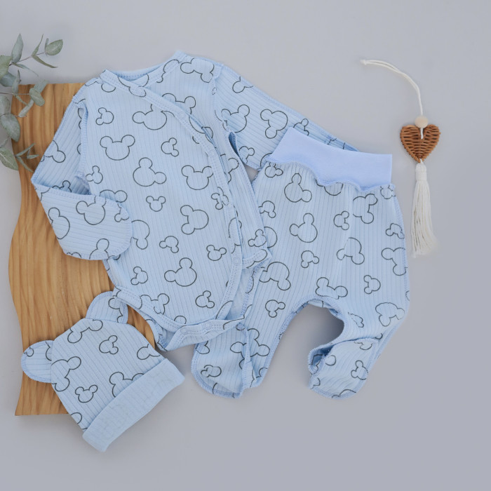 Набір 3в1: Боді-розпашонка, повзунки та шапочка Міккі Блакитний (Рубчик) 62 (3-6міс)