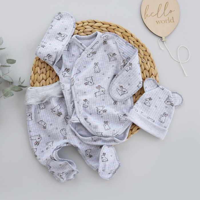 Набір 3в1: Боді-розпашонка, повзунки та шапочка Зайчик Сірий (Рубчик) 56 (0-3міс)