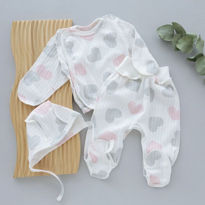 Набір 3в1: Льоля, повзунки та шапочка на зав’язках Сердечка великі (Рубчик) 56 (0-3міс)
