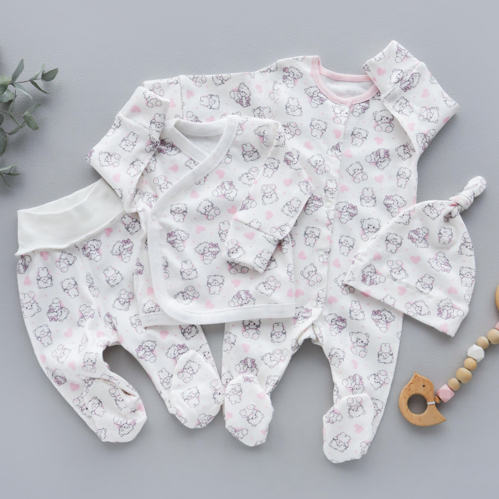 Набір 4в1: Чоловічок, льоля, повзунки, шапочка вузлик Котики Рожевий (Інтерлок) 62 (3-6міс)
