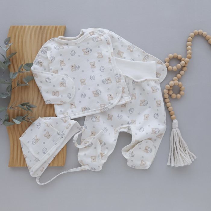 Набір 3в1: Льоля, повзунки та шапочка на зав’язках Ведмедик зайчик Молочний (Футер - з начосом) 62 (1-3міс)