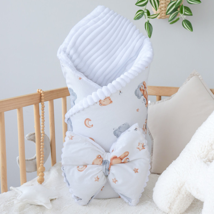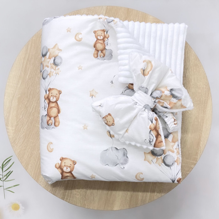 Плед зі зʼємним утепленням та бантом-резинкою Ведмедик з кульками /Білий плюш 90/80