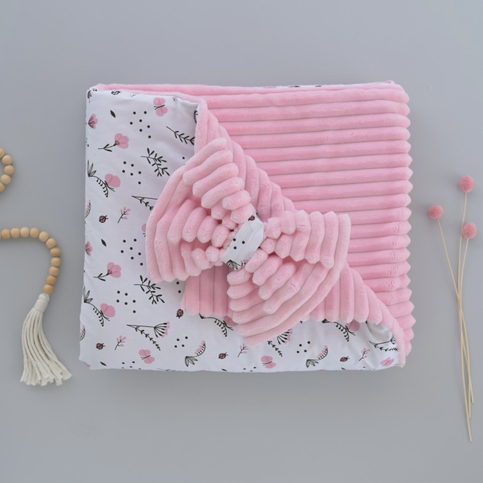 Плед зі з‘ємним утеплювачем та бантом-резинкою Квіточки Рожевий / Рожевий плюш 90/80
