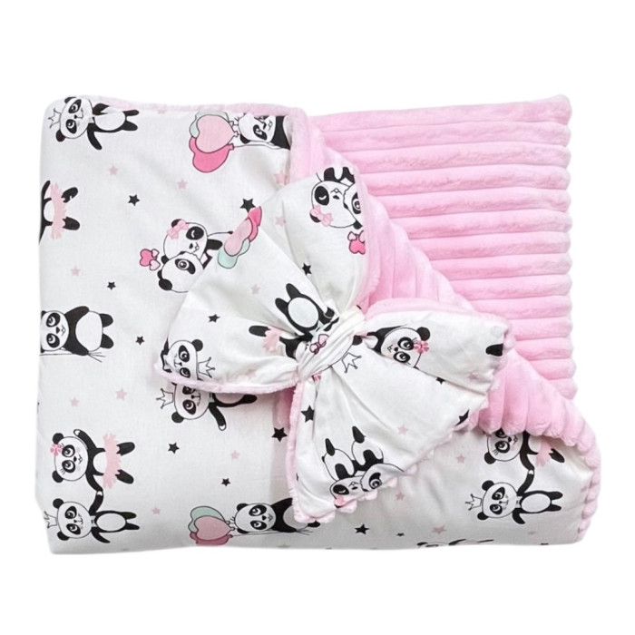 Плед зі з‘ємним утеплювачем та бантом-резинкою Панди Рожевий / Рожевий плюш 90/80