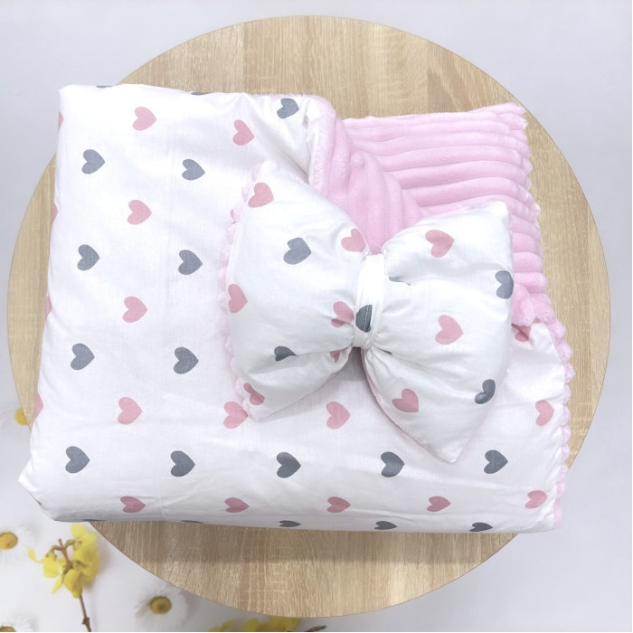 Плед зі з‘ємним утеплювачем та бантом-резинкою Сердечка Рожевий /Рожевий плюш 90/80