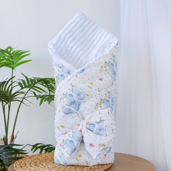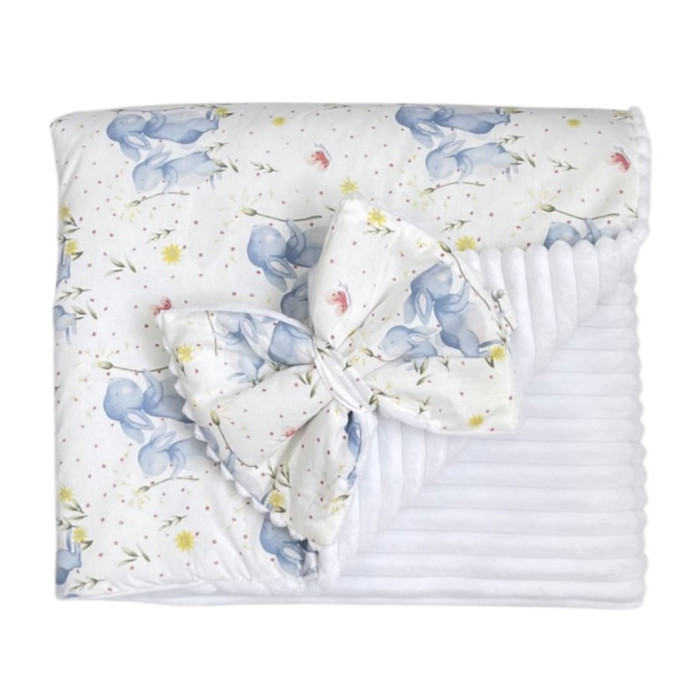 Плед зі зʼємним утеплювачем та бантом-резинкою Зайчики Блакитний /Білий плюш 90/80