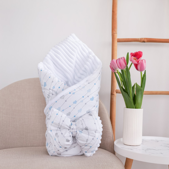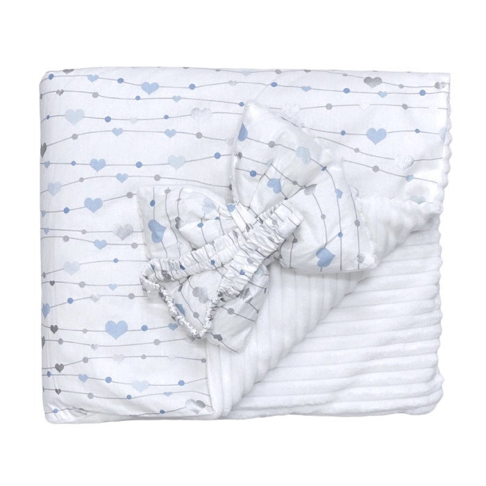 Плед зі зʼємним утепленням та бантом -резинкою Сердечка Блакитний -Сірий (гліттер) /Білий плюш 90/80