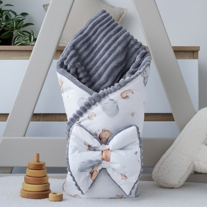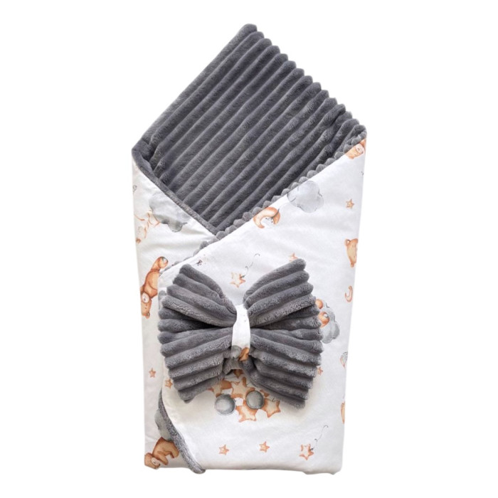 Плед зі зʼємним утепленням та бантом-резинкою Ведмедик з кульками /Сірий плюш 90/80