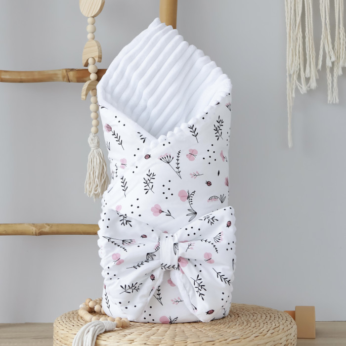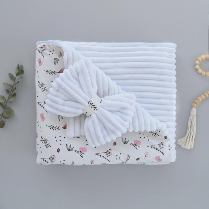 Плед зі з‘ємним утеплювачем та бантом-резинкою Квіточки Рожевий / Білий плюш 90/80
