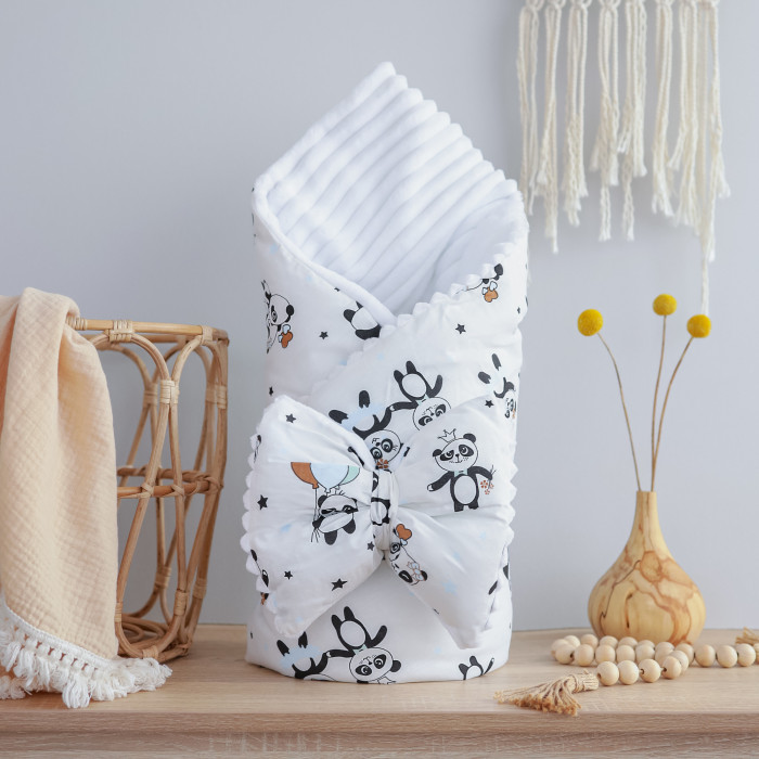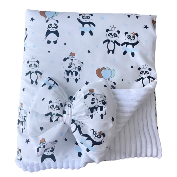 Плед зі з‘ємним утеплювачем та бантом-резинкою Панди Блакитний / Білий плюш 90/80