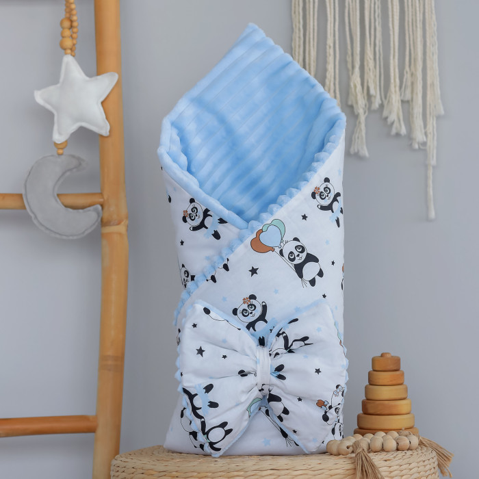 Плед зі з‘ємним утеплювачем та бантом-резинкою Панди Блакитний / Блакитний плюш 90/80
