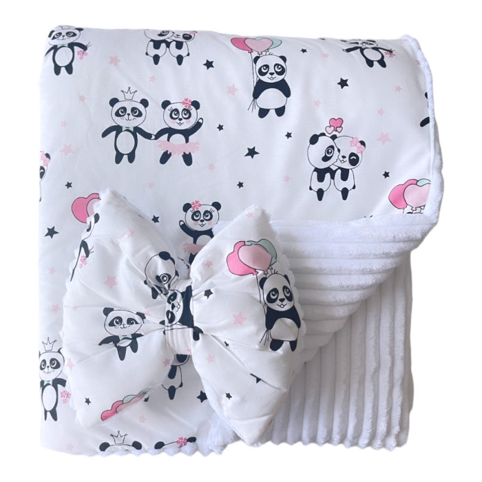 Плед зі з‘ємним утеплювачем та бантом-резинкою Панди Рожевий / Білий плюш 90/80