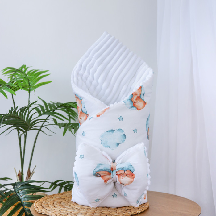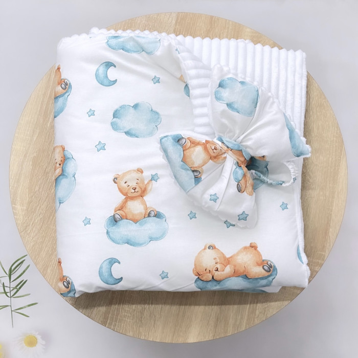 Плед зі з‘ємним утеплювачем та бантом-резинкою Ведмедик на хмаринці Бірюзовий /Білий плюш 90/80