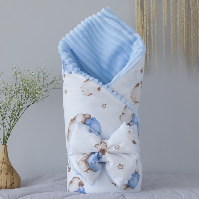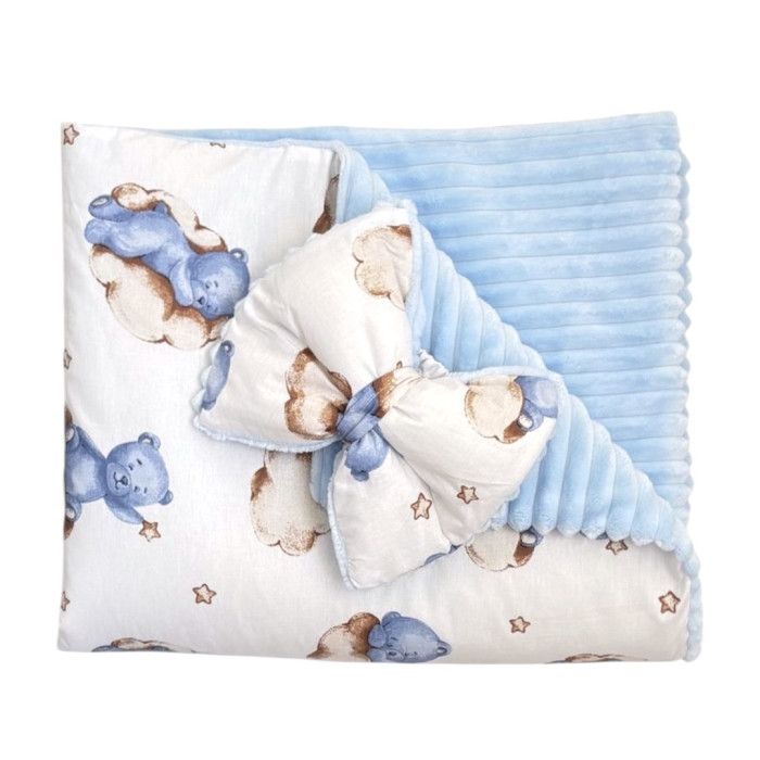 Плед зі з‘ємним утеплювачем та бантом-резинкою Ведмедик на хмаринці Блакитний/ Блакитний плюш 90/80
