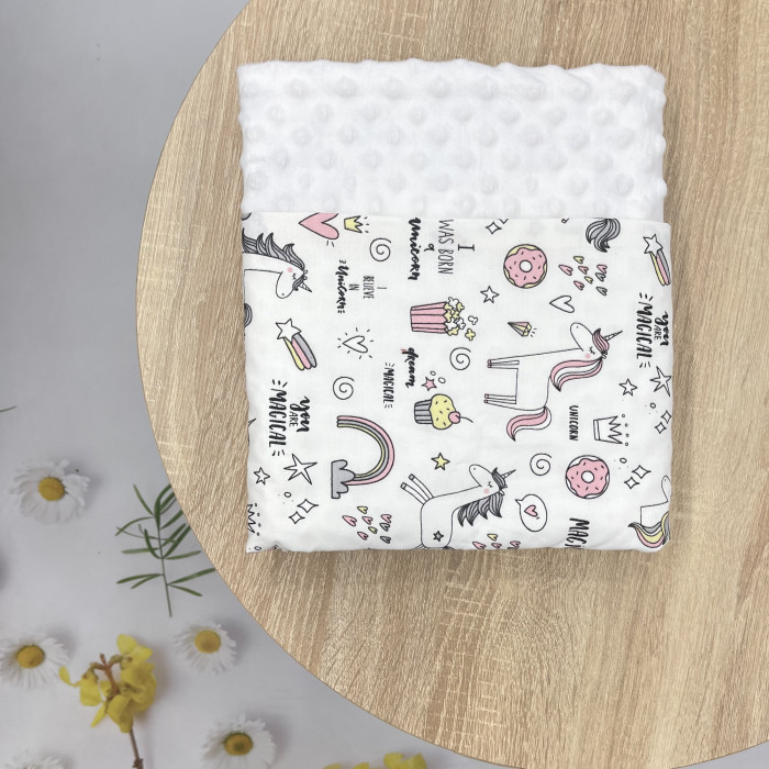 Плед плюш, без утеплення Единоріжка /Білий плюш пупиришка 100/80