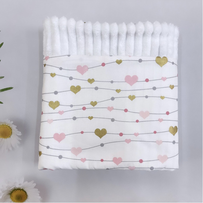 Плед плюш, без утеплення Сердечка Рожевий -Золото (гліттер) /Білий плюш 100/80