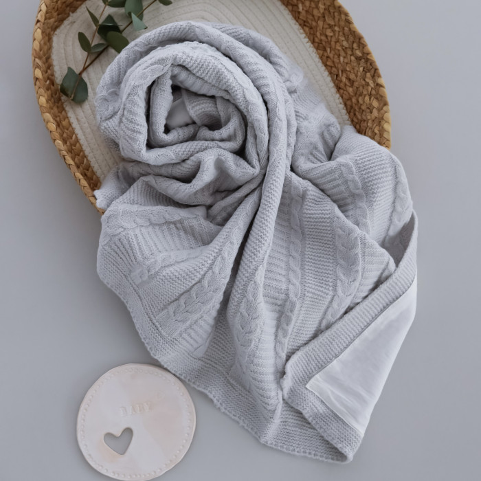 Вʼязаний плед демісезонний з підкладкою Сірий косичка 90/80