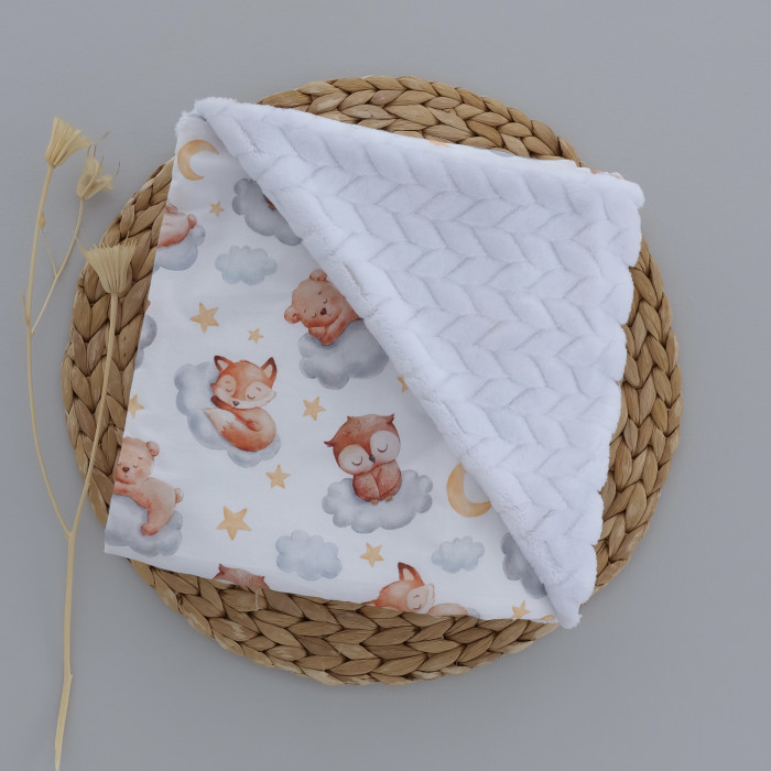 Плед плюш, без утеплення Лисички на хмаринці/ Білий плюш косичка 100/80